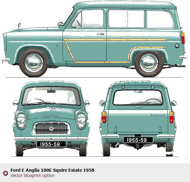 Raster blueprint of the 1958 Ford E Anglia 100E Squire Estate Wagon. This free downloadable image can be used for graphic projects, digital design, and 3D modeling. The file provides accurate exterior proportions of the vehicle. Model year: 1958. Body type: Wagon.