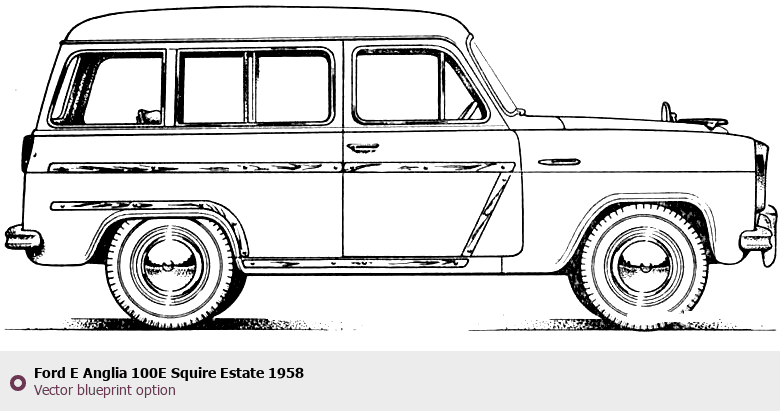 Raster blueprint of the 1958 Ford E Anglia 100E Squire Estate Wagon. This free downloadable image can be used for graphic projects, digital design, and 3D modeling. The file provides accurate exterior proportions of the vehicle. Model year: 1958. Body type: Wagon.