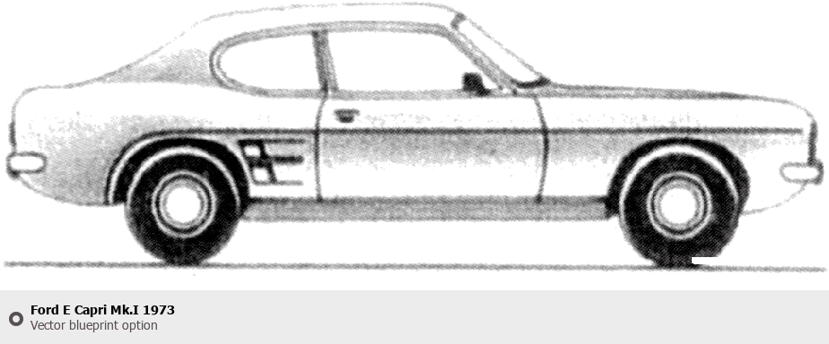 Raster blueprint of the 1973 Ford E Capri Mk.I Tag. This free downloadable image can be used for graphic projects, digital design, and 3D modeling. The file provides accurate exterior proportions of the vehicle. Model year: 1973. Body type: Tag.