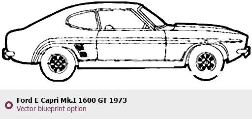 Raster blueprint of the 1973 Ford E Capri Mk.I 1600 GT Coupe. This free downloadable image can be used for graphic projects, digital design, and 3D modeling. The file provides accurate exterior proportions of the vehicle. Model year: 1973. Body type: Coupe.