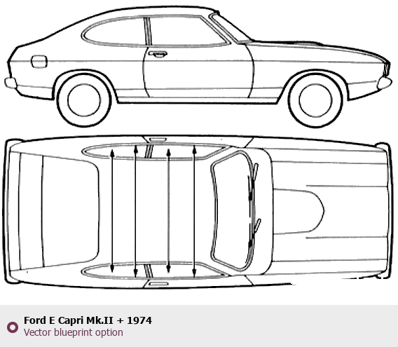 Raster blueprint of the 1974 Ford E Capri Mk.II + Tag. This free downloadable image can be used for graphic projects, digital design, and 3D modeling. The file provides accurate exterior proportions of the vehicle. Model year: 1974. Body type: Tag.
