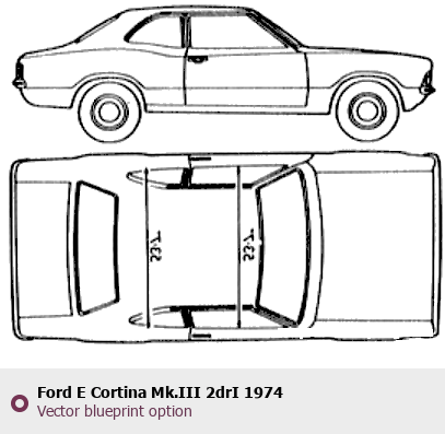 Raster blueprint of the 1974 Ford E Cortina Mk.III 2drI Tag. This free downloadable image can be used for graphic projects, digital design, and 3D modeling. The file provides accurate exterior proportions of the vehicle. Model year: 1974. Body type: Tag.
