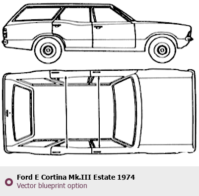 Raster blueprint of the 1974 Ford E Cortina Mk.III Estate Wagon. This free downloadable image can be used for graphic projects, digital design, and 3D modeling. The file provides accurate exterior proportions of the vehicle. Model year: 1974. Body type: Wagon.