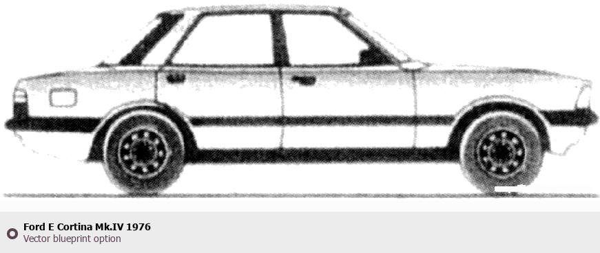 Raster blueprint of the 1976 Ford E Cortina Mk.IV Tag. This free downloadable image can be used for graphic projects, digital design, and 3D modeling. The file provides accurate exterior proportions of the vehicle. Model year: 1976. Body type: Tag.