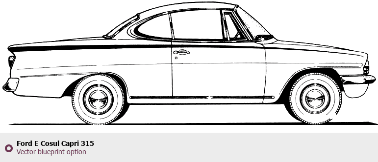 Raster blueprint of the Ford E Cosul Capri 315 Tag. This free downloadable image can be used for graphic projects, digital design, and 3D modeling. The file provides accurate exterior proportions of the vehicle. Body type: Tag.