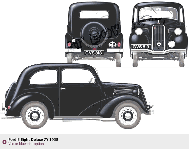 Raster blueprint of the 1938 Ford E Eight Deluxe 7Y Tag. This free downloadable image can be used for graphic projects, digital design, and 3D modeling. The file provides accurate exterior proportions of the vehicle. Model year: 1938. Body type: Tag.