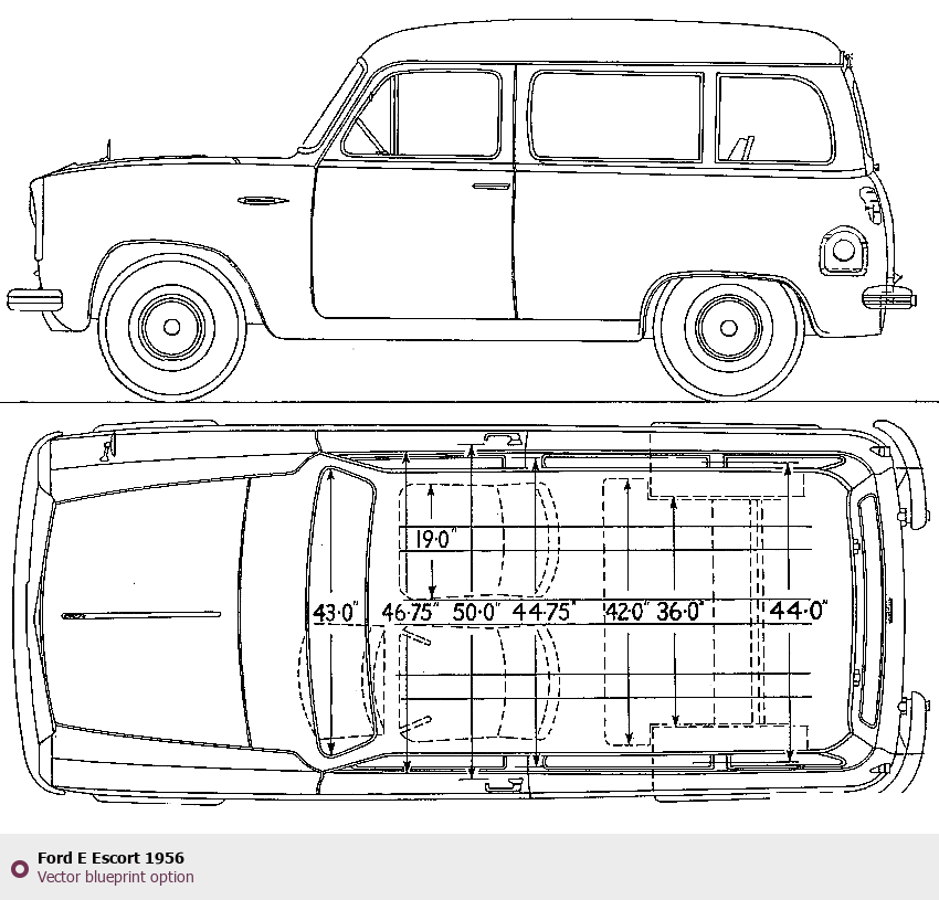 Raster blueprint of the 1956 Ford E Escort Tag. This free downloadable image can be used for graphic projects, digital design, and 3D modeling. The file provides accurate exterior proportions of the vehicle. Model year: 1956. Body type: Tag.