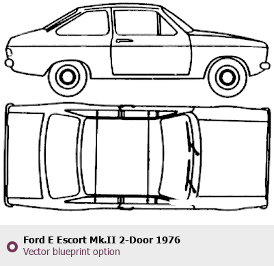 Raster blueprint of the 1976 Ford E Escort Mk.II 2-Door Tag. This free downloadable image can be used for graphic projects, digital design, and 3D modeling. The file provides accurate exterior proportions of the vehicle. Model year: 1976. Body type: Tag.