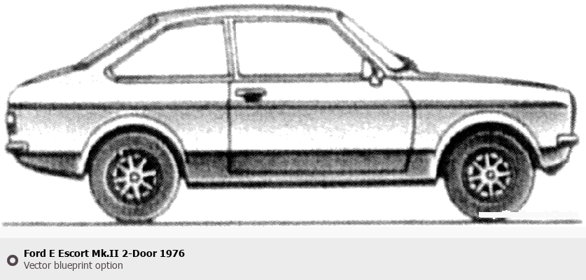 Raster blueprint of the 1976 Ford E Escort Mk.II 2-Door Tag. This free downloadable image can be used for graphic projects, digital design, and 3D modeling. The file provides accurate exterior proportions of the vehicle. Model year: 1976. Body type: Tag.