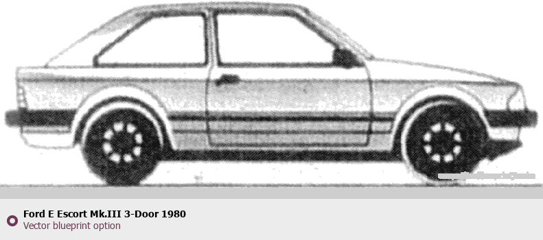 Raster blueprint of the 1980 Ford E Escort Mk.III 3-Door Tag. This free downloadable image can be used for graphic projects, digital design, and 3D modeling. The file provides accurate exterior proportions of the vehicle. Model year: 1980. Body type: Tag.
