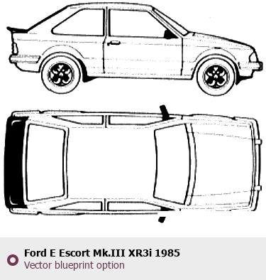 Raster blueprint of the 1985 Ford E Escort Mk.III XR3i Tag. This free downloadable image can be used for graphic projects, digital design, and 3D modeling. The file provides accurate exterior proportions of the vehicle. Model year: 1985. Body type: Tag.