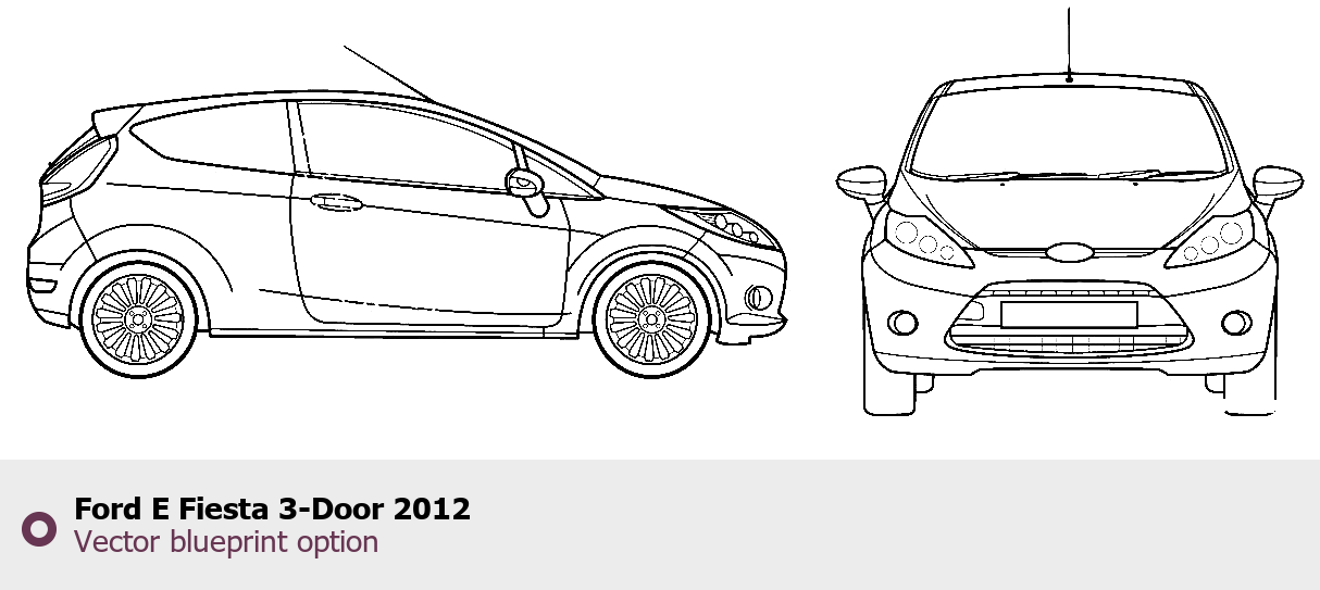 Raster blueprint of the 2012 Ford E Fiesta 3-Door Tag. This free downloadable image can be used for graphic projects, digital design, and 3D modeling. The file provides accurate exterior proportions of the vehicle. Model year: 2012. Body type: Tag.