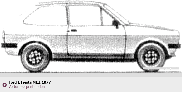 Raster blueprint of the 1977 Ford E Fiesta Mk.I Tag. This free downloadable image can be used for graphic projects, digital design, and 3D modeling. The file provides accurate exterior proportions of the vehicle. Model year: 1977. Body type: Tag.