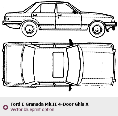Raster blueprint of the 1984 Ford E Granada Mk.II 4-Door Ghia X Tag. This free downloadable image can be used for graphic projects, digital design, and 3D modeling. The file provides accurate exterior proportions of the vehicle. Model year: 1984. Body type: Tag.