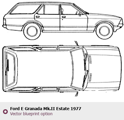 Raster blueprint of the 1977 Ford E Granada Mk.II Estate Wagon. This free downloadable image can be used for graphic projects, digital design, and 3D modeling. The file provides accurate exterior proportions of the vehicle. Model year: 1977. Body type: Wagon.