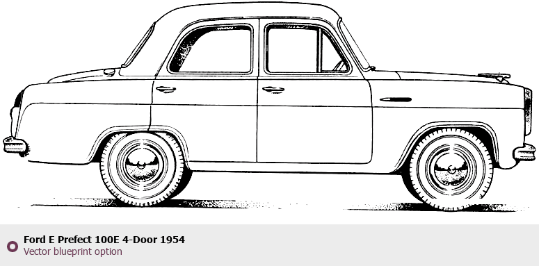 Raster blueprint of the 1954 Ford E Prefect 100E 4-Door Sedan. This free downloadable image can be used for graphic projects, digital design, and 3D modeling. The file provides accurate exterior proportions of the vehicle. Model year: 1954. Body type: Sedan.