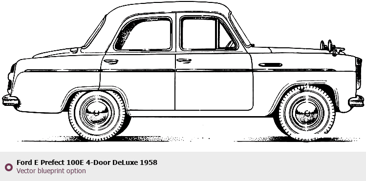 Raster blueprint of the 1958 Ford E Prefect 100E 4-Door DeLuxe Sedan. This free downloadable image can be used for graphic projects, digital design, and 3D modeling. The file provides accurate exterior proportions of the vehicle. Model year: 1958. Body type: Sedan.