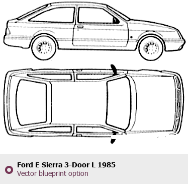 Raster blueprint of the 1985 Ford E Sierra 3-Door L Tag. This free downloadable image can be used for graphic projects, digital design, and 3D modeling. The file provides accurate exterior proportions of the vehicle. Model year: 1985. Body type: Tag.