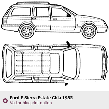 Raster blueprint of the 1985 Ford E Sierra Estate Ghia Wagon. This free downloadable image can be used for graphic projects, digital design, and 3D modeling. The file provides accurate exterior proportions of the vehicle. Model year: 1985. Body type: Wagon.