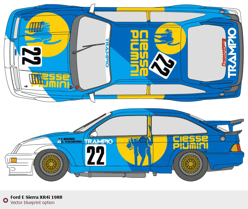 Raster blueprint of the 1988 Ford E Sierra XR4i Tag. This free downloadable image can be used for graphic projects, digital design, and 3D modeling. The file provides accurate exterior proportions of the vehicle. Model year: 1988. Body type: Tag.