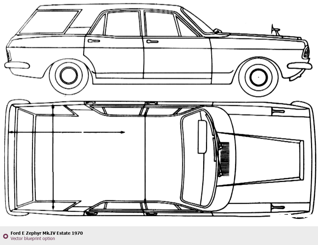 Raster blueprint of the 1970 Ford E Zephyr Mk.IV Estate Wagon. This free downloadable image can be used for graphic projects, digital design, and 3D modeling. The file provides accurate exterior proportions of the vehicle. Model year: 1970. Body type: Wagon.