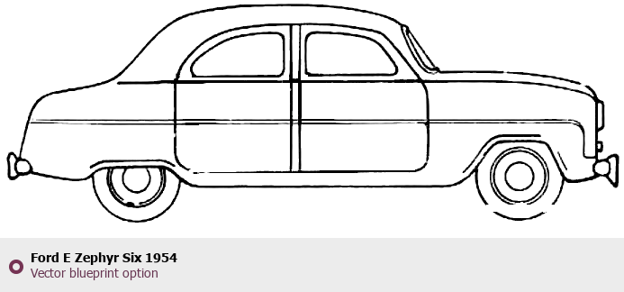 Raster blueprint of the 1954 Ford E Zephyr Six Tag. This free downloadable image can be used for graphic projects, digital design, and 3D modeling. The file provides accurate exterior proportions of the vehicle. Model year: 1954. Body type: Tag.