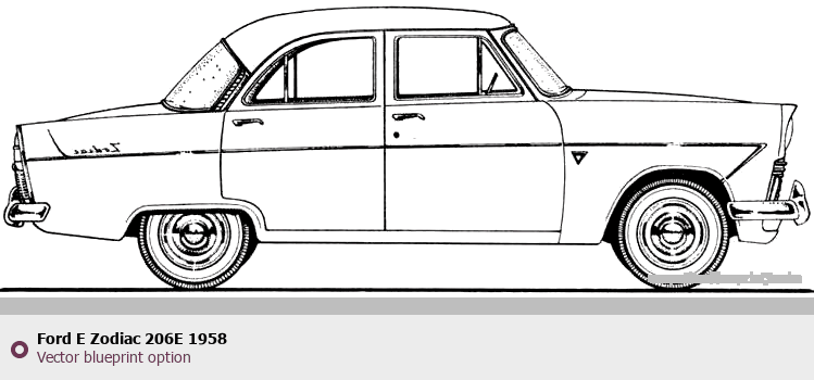 Raster blueprint of the 1958 Ford E Zodiac 206E Tag. This free downloadable image can be used for graphic projects, digital design, and 3D modeling. The file provides accurate exterior proportions of the vehicle. Model year: 1958. Body type: Tag.