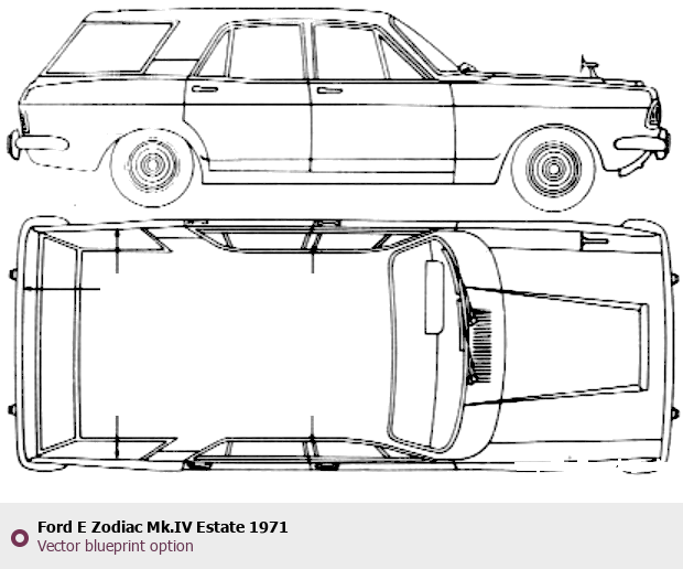 Raster blueprint of the 1971 Ford E Zodiac Mk.IV Estate Wagon. This free downloadable image can be used for graphic projects, digital design, and 3D modeling. The file provides accurate exterior proportions of the vehicle. Model year: 1971. Body type: Wagon.