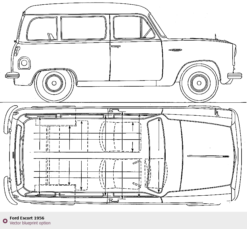 Raster blueprint of the 1956 Ford Escort Tag. This free downloadable image can be used for graphic projects, digital design, and 3D modeling. The file provides accurate exterior proportions of the vehicle. Model year: 1956. Body type: Tag.