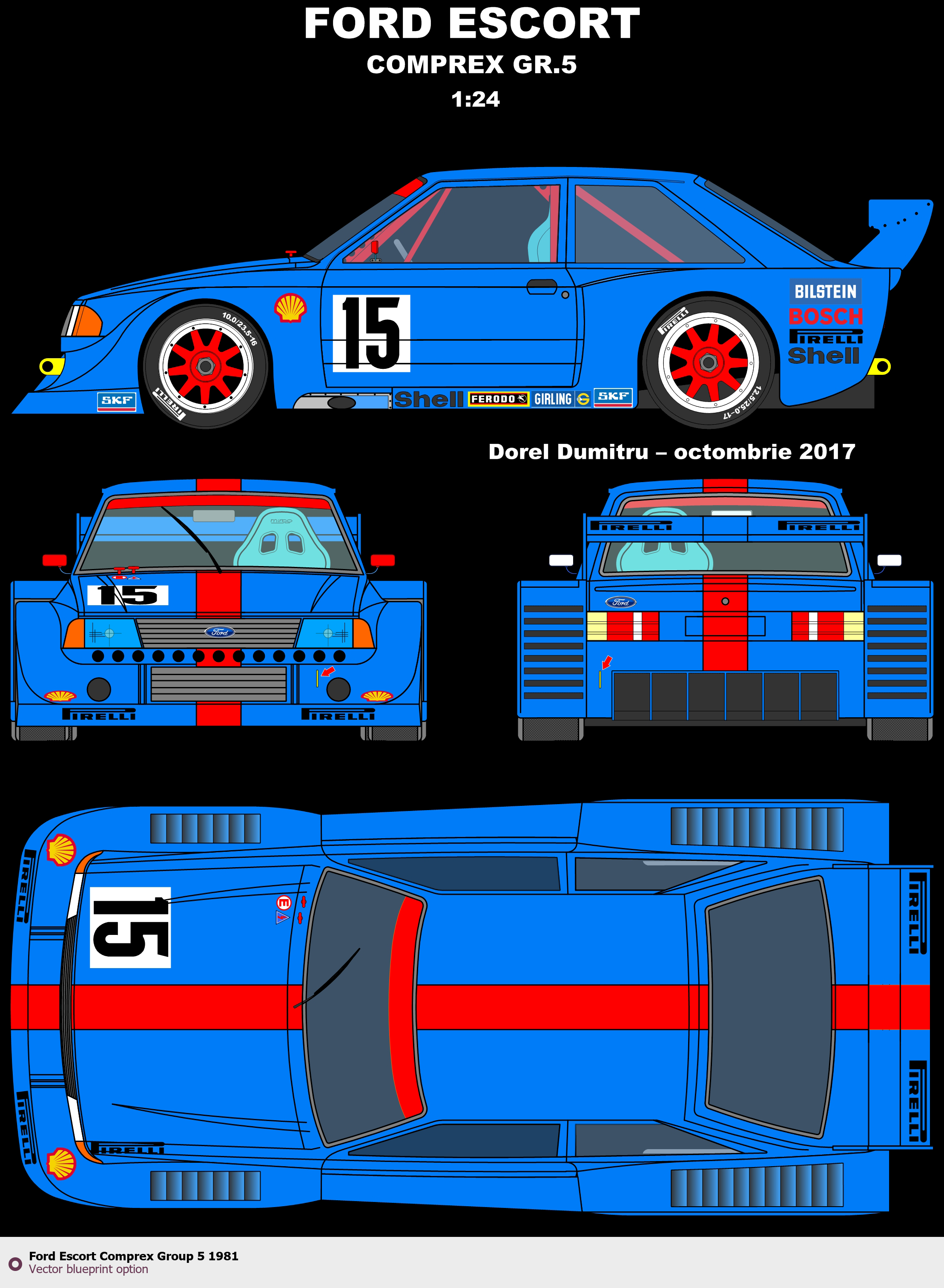 Raster blueprint of the 1981 Ford Escort Comprex Group 5 Tag. This free downloadable image can be used for graphic projects, digital design, and 3D modeling. The file provides accurate exterior proportions of the vehicle. Model year: 1981. Body type: Tag.