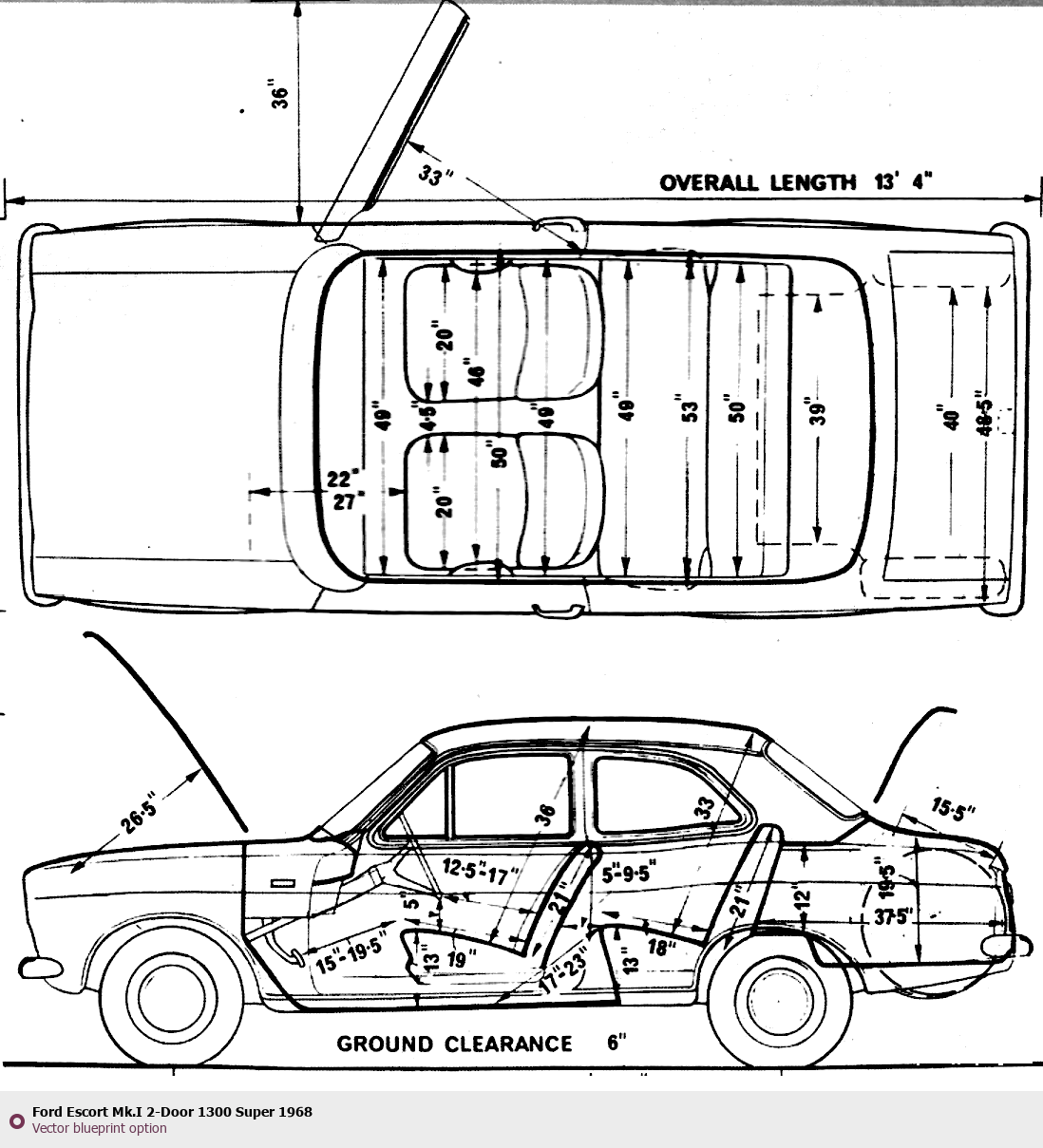 Raster blueprint of the 1968 Ford Escort Mk.I 2-Door 1300 Super Tag. This free downloadable image can be used for graphic projects, digital design, and 3D modeling. The file provides accurate exterior proportions of the vehicle. Model year: 1968. Body type: Tag.