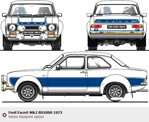 Raster blueprint of the 1973 Ford Escort Mk.I RS2000 Tag. This free downloadable image can be used for graphic projects, digital design, and 3D modeling. The file provides accurate exterior proportions of the vehicle. Model year: 1973. Body type: Tag.