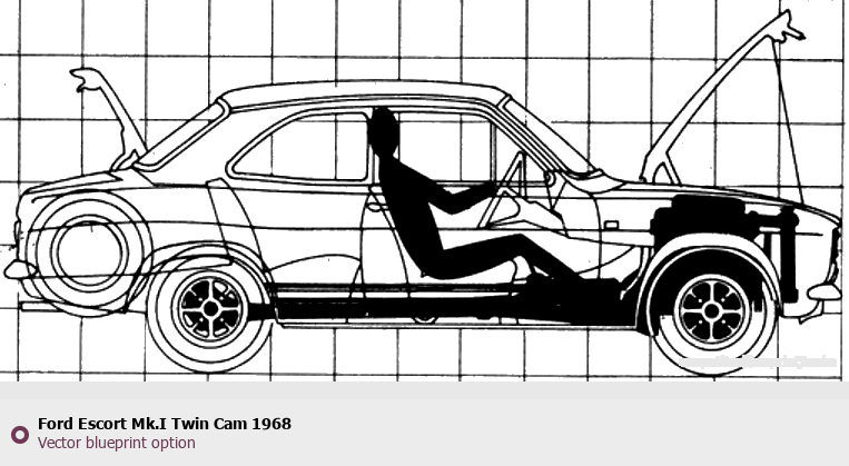 Raster blueprint of the 1968 Ford Escort Mk.I Twin Cam Tag. This free downloadable image can be used for graphic projects, digital design, and 3D modeling. The file provides accurate exterior proportions of the vehicle. Model year: 1968. Body type: Tag.
