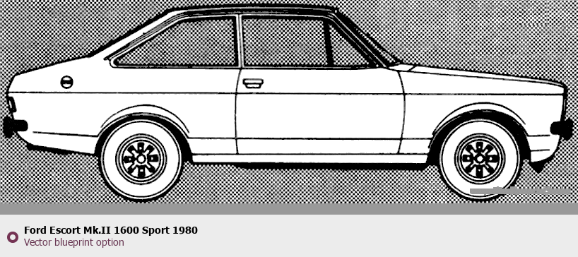 Raster blueprint of the 1980 Ford Escort Mk.II 1600 Sport Tag. This free downloadable image can be used for graphic projects, digital design, and 3D modeling. The file provides accurate exterior proportions of the vehicle. Model year: 1980. Body type: Tag.