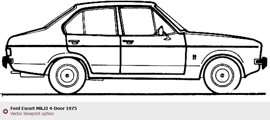 Raster blueprint of the 1975 Ford Escort Mk.II 4-Door Tag. This free downloadable image can be used for graphic projects, digital design, and 3D modeling. The file provides accurate exterior proportions of the vehicle. Model year: 1975. Body type: Tag.