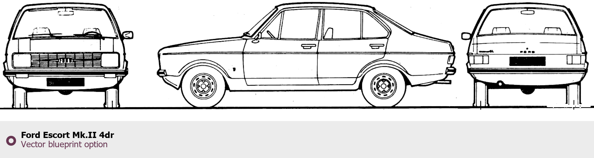 Raster blueprint of the Ford Escort Mk.II 4dr Tag. This free downloadable image can be used for graphic projects, digital design, and 3D modeling. The file provides accurate exterior proportions of the vehicle. Body type: Tag.