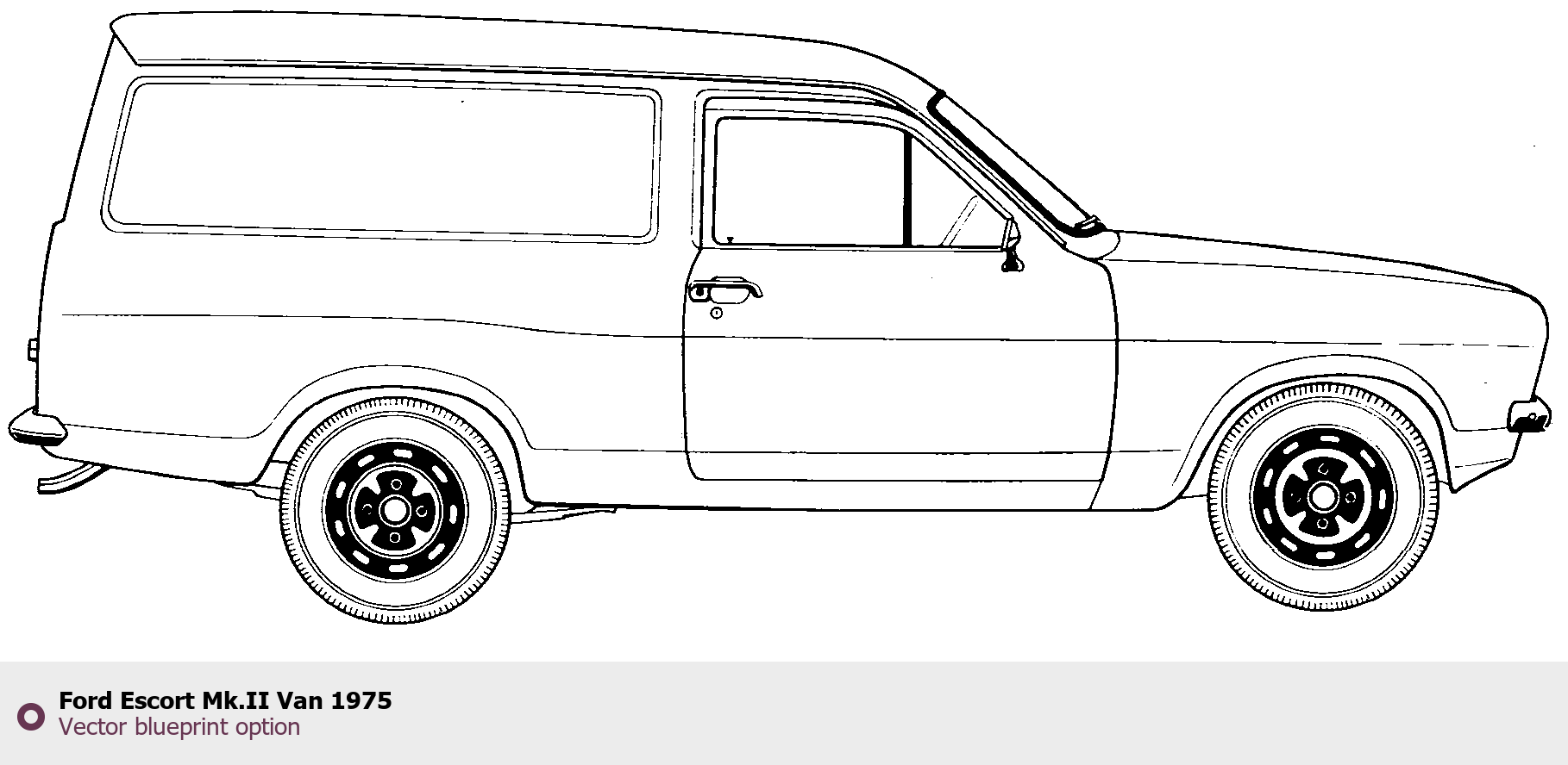 Raster blueprint of the 1975 Ford Escort Mk.II Van Van. This free downloadable image can be used for graphic projects, digital design, and 3D modeling. The file provides accurate exterior proportions of the vehicle. Model year: 1975. Body type: Van.