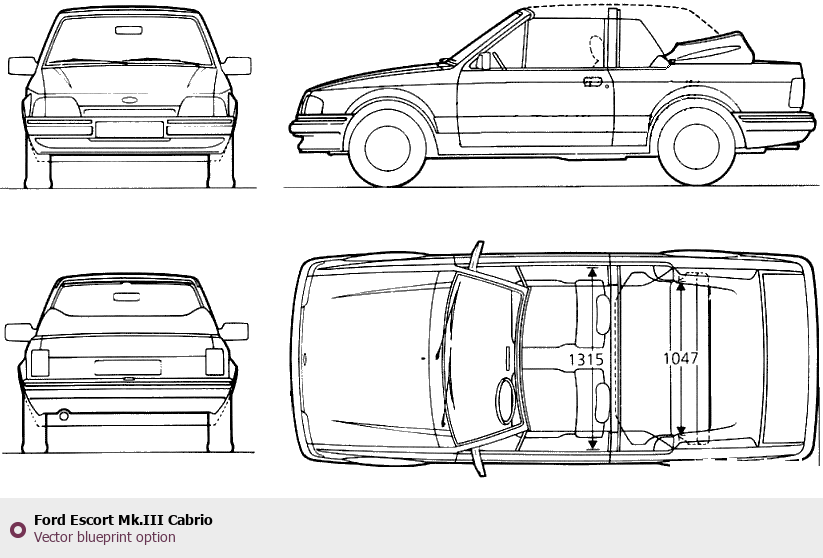 Raster blueprint of the Ford Escort Mk.III Cabrio Cabriolet. This free downloadable image can be used for graphic projects, digital design, and 3D modeling. The file provides accurate exterior proportions of the vehicle. Body type: Cabriolet.