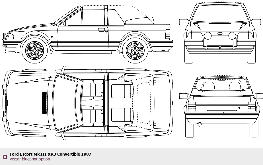 Raster blueprint of the 1987 Ford Escort Mk.III XR3 Convertible Cabriolet. This free downloadable image can be used for graphic projects, digital design, and 3D modeling. The file provides accurate exterior proportions of the vehicle. Model year: 1987. Body type: Cabriolet.