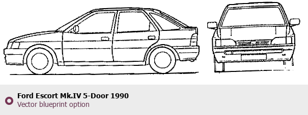 Raster blueprint of the 1990 Ford Escort Mk.IV 5-Door Tag. This free downloadable image can be used for graphic projects, digital design, and 3D modeling. The file provides accurate exterior proportions of the vehicle. Model year: 1990. Body type: Tag.