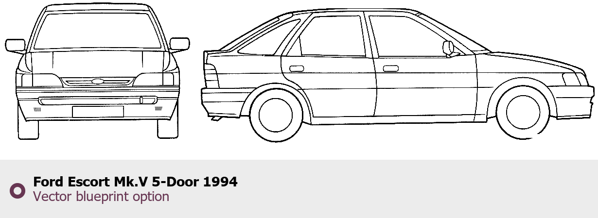 Raster blueprint of the 1994 Ford Escort Mk.V 5-Door Tag. This free downloadable image can be used for graphic projects, digital design, and 3D modeling. The file provides accurate exterior proportions of the vehicle. Model year: 1994. Body type: Tag.