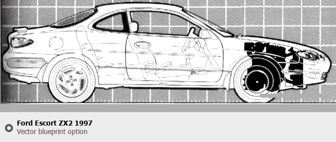 Raster blueprint of the 1997 Ford Escort ZX2 Tag. This free downloadable image can be used for graphic projects, digital design, and 3D modeling. The file provides accurate exterior proportions of the vehicle. Model year: 1997. Body type: Tag.