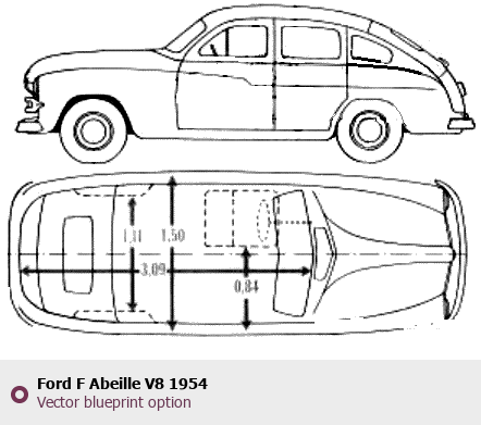 Raster blueprint of the 1954 Ford F Abeille V8 Coupe. This free downloadable image can be used for graphic projects, digital design, and 3D modeling. The file provides accurate exterior proportions of the vehicle. Model year: 1954. Body type: Coupe.