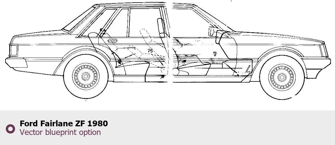 Raster blueprint of the 1980 Ford Fairlane ZF Tag. This free downloadable image can be used for graphic projects, digital design, and 3D modeling. The file provides accurate exterior proportions of the vehicle. Model year: 1980. Body type: Tag.