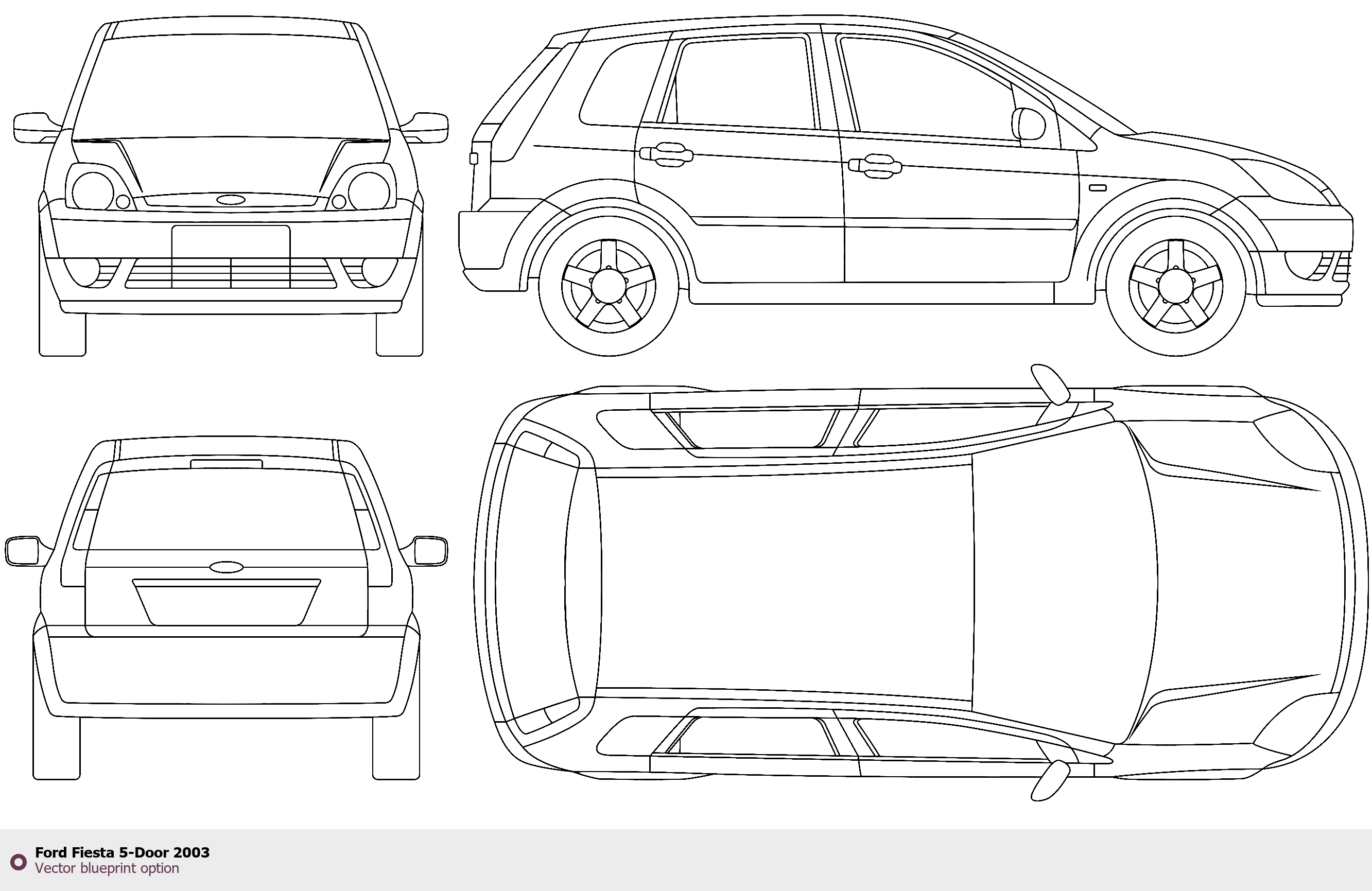 Raster blueprint of the 2003 Ford Fiesta 5-Door Tag. This free downloadable image can be used for graphic projects, digital design, and 3D modeling. The file provides accurate exterior proportions of the vehicle. Model year: 2003. Body type: Tag.