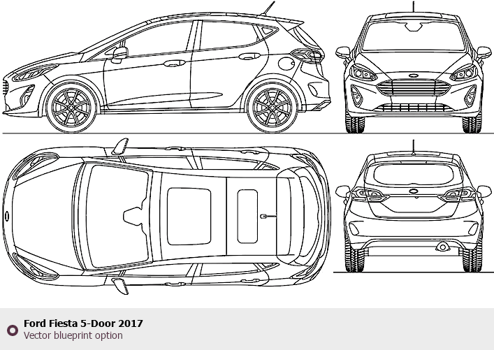 Raster blueprint of the 2017 Ford Fiesta 5-Door Tag. This free downloadable image can be used for graphic projects, digital design, and 3D modeling. The file provides accurate exterior proportions of the vehicle. Model year: 2017. Body type: Tag.