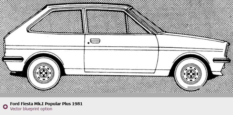 Raster blueprint of the 1981 Ford Fiesta Mk.I Popular Plus Tag. This free downloadable image can be used for graphic projects, digital design, and 3D modeling. The file provides accurate exterior proportions of the vehicle. Model year: 1981. Body type: Tag.