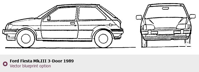 Raster blueprint of the 1989 Ford Fiesta Mk.III 3-Door Tag. This free downloadable image can be used for graphic projects, digital design, and 3D modeling. The file provides accurate exterior proportions of the vehicle. Model year: 1989. Body type: Tag.