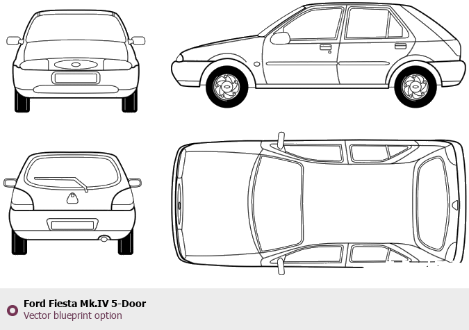 Raster blueprint of the Ford Fiesta Mk.IV 5-Door Tag. This free downloadable image can be used for graphic projects, digital design, and 3D modeling. The file provides accurate exterior proportions of the vehicle. Body type: Tag.