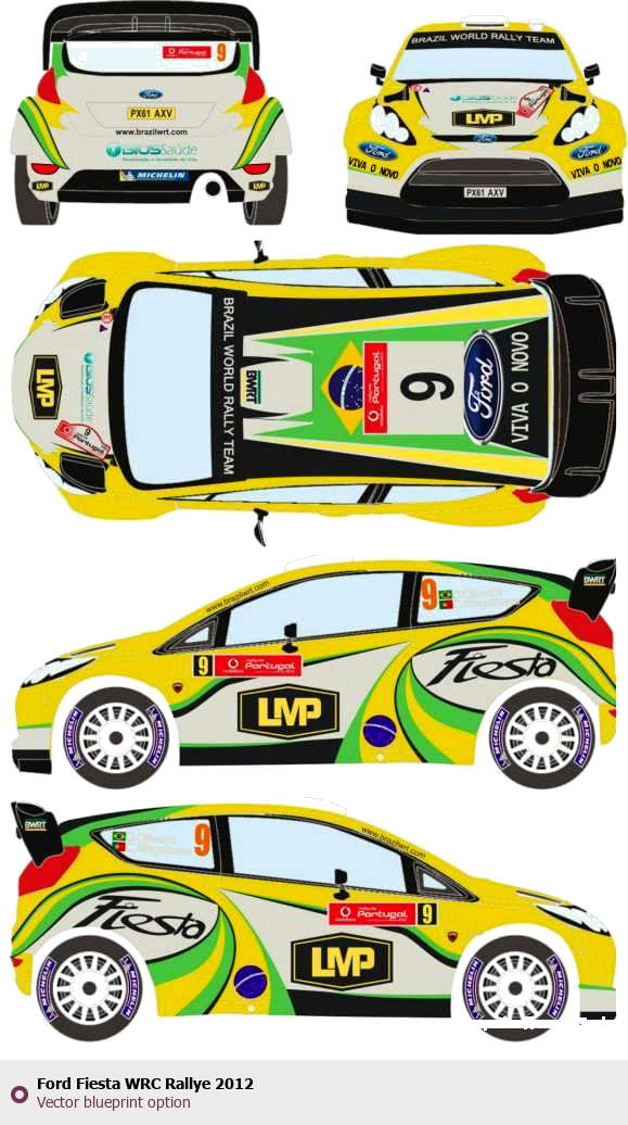 Raster blueprint of the 2012 Ford Fiesta WRC Rallye Tag. This free downloadable image can be used for graphic projects, digital design, and 3D modeling. The file provides accurate exterior proportions of the vehicle. Model year: 2012. Body type: Tag.